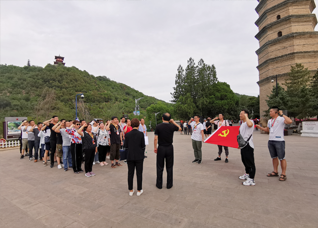 我們領略寶塔山的巍峨,感受延安三山環繞的恢弘地勢,置身于寶塔山上,黨員們面對鮮紅黨旗,舉起右拳重溫入黨誓詞,回望入黨初心。天氣雖然炎熱,但一行人還是選擇克服困難,堅持不懈,終于登上寶塔山的最高點——摘星樓,站在摘星樓上俯視整個延安城,三川風貌盡收眼底,別有一番情趣。